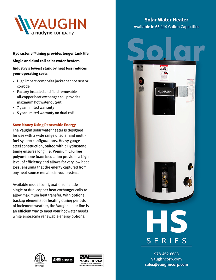 Vaughn Solar Water Heaters are optimal for a range of solar and multi-fuel system setups. They feature a field-removable copper heat exchanger mounted on a double O-ring flange. This maximizes hot water output and prevents electrolysis. The storage tank is lined with ½" HydraStone™ cement, which provides lasting protection against corrosion and eliminates the need for a sacrificial anode rod. Plus, a durable plastic jacket resists rust and damage. That means fewer service calls and lower maintenance costs.